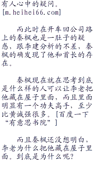听到李建的话,大家都明白了。一号首长可不是习武之人,自然不会懂的什么隐藏气息之类的“九八七”。想必秦枫就是这样发现的。