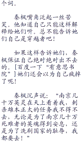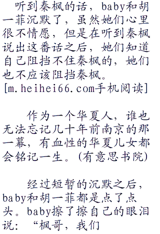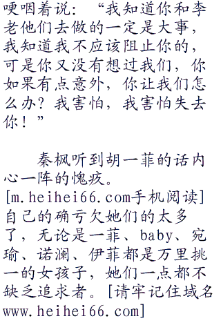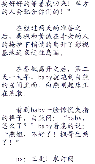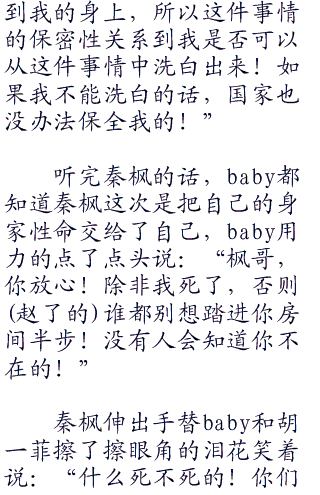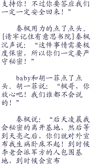 秦枫伸手把胡一菲和baby都揽入自己的怀里轻声的说:“我答应你们,我不会有任何危险的,一定会安全回来的!”