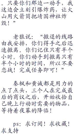 三个人商议好之后,很快的就开始筹备起炸毁靖国神社的计划了。秦枫的意思是在刺杀雄本正太的当天,分两路行动。然后完成任务之后撤离岛国。