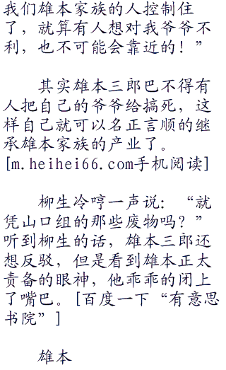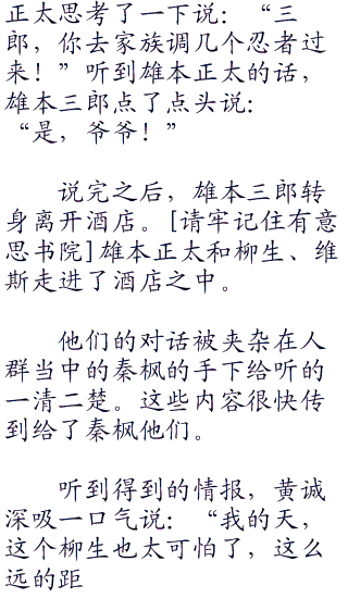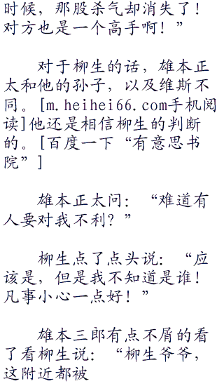雄本正太也发现那个老人的举动诧异的问:“柳生君,怎么了?”被称作柳生君的老人沉声说:“我感觉到了杀气!我感觉今天有事情要发生!”
