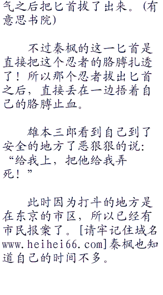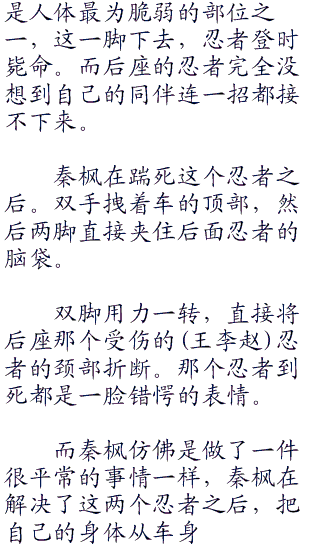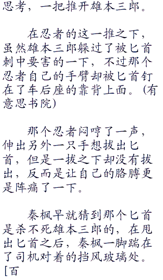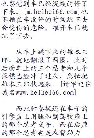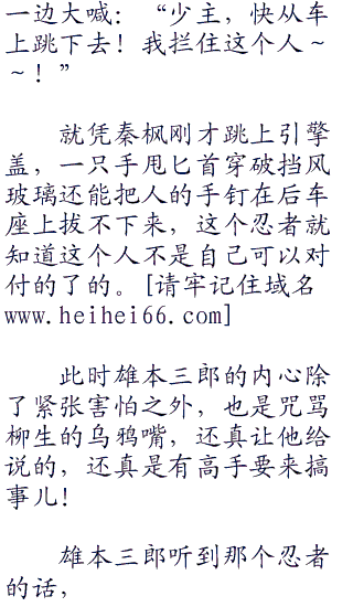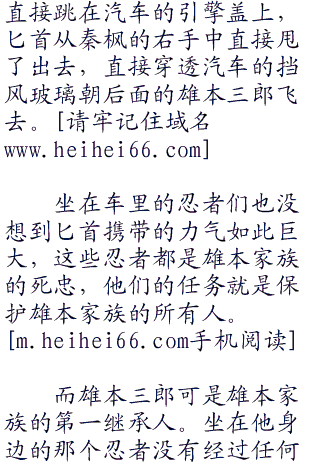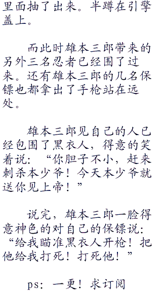 看着一步一步走向自己车子的黑衣人,雄本三郎用低沉的声音说:“开车撞死他!”