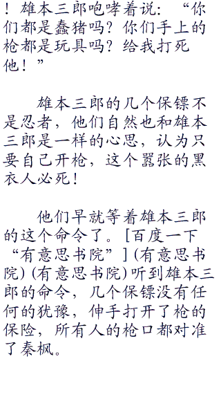 而雄本三郎到现在还不知道死神已经在向自己招手了。他对自己手下带着枪太过于自信了,虽然两个忍者在极短的时间之内就死了,但是雄本三郎还是认为自己手中的枪就可以把这个胆敢来刺杀自己的来犯者打成马蜂窝。
