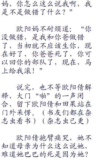 欧阳妈看起来有些急躁,突然开口责骂道:“你回来干什么,我们家不欢迎你,赶紧给我滚!”