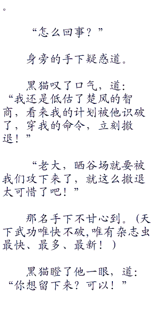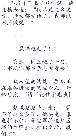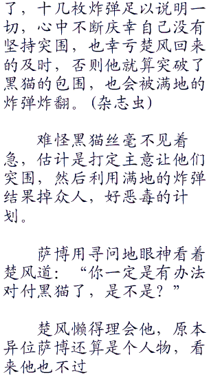 萨博愁眉苦脸道:“在这么下去,就算不被杀死,也会被黑猫的人拖死,不行,我要准备突围!”