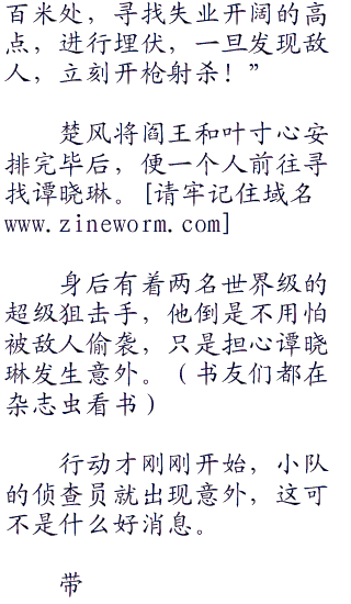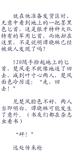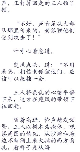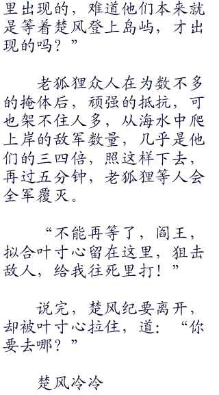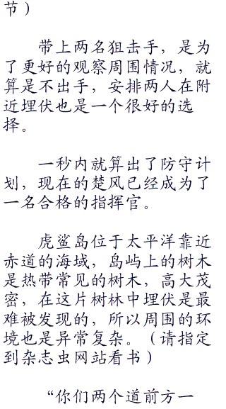 楚风的任务与他们不同,作为特种战队,他们美标跟普通军队一样守护岛屿,特种兵的特性如同一把利刃,必须以攻为守,而他们的目标无疑是最为简单直接,同样也是最为困难的,那就是直接斩掉敌军的首脑。