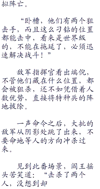 沈兰妮着急道:“不行,敌人的火力太猛,只要我们稍微露一下头,铁定吃子弹!”
