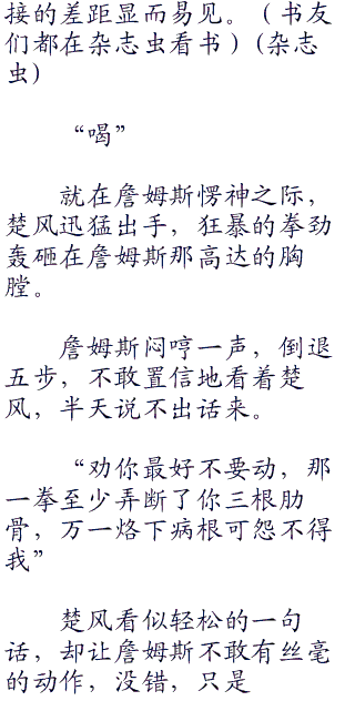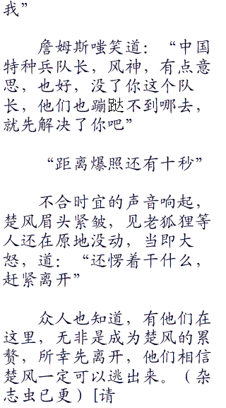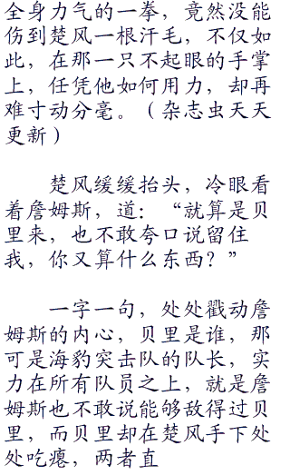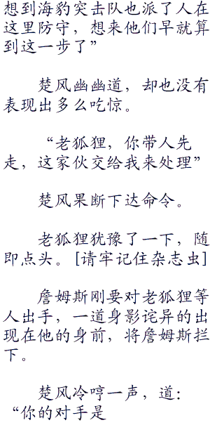 楚风冷眼看着他,好像在哪里见过,这时,他鸟林凑到耳边道:“这人我见过,是海豹突击队的成员,名字应该是詹姆斯,是个世界级的突击手”