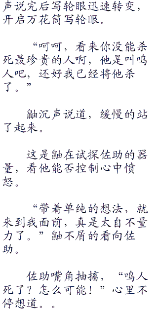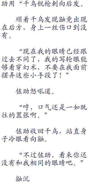 鼬话锋一转,略有深意的向佐助问道:“你那双写轮眼能看到多远。”