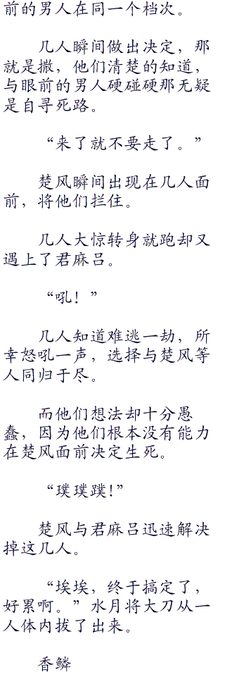 楚风对着不远处的香鳞喊道:“香鳞.你退到一边吧,这里有我们就够了。”