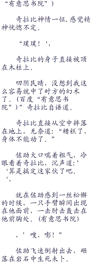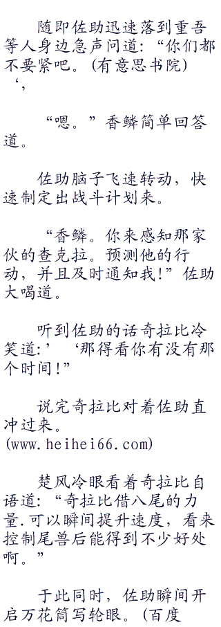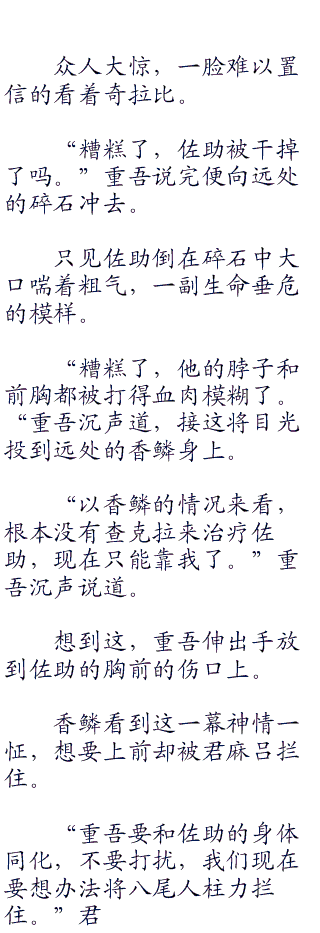 佐助神情一怔.他都没想到奇拉比会突然出手,这种时刻,佐助只好双手格挡。