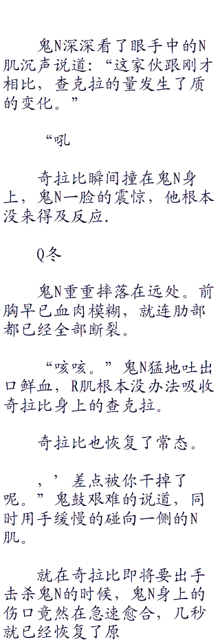 下一秒鬼R眼神一冷。将N肌从后背上拿出接着对前方的奇拉比横扫过去。