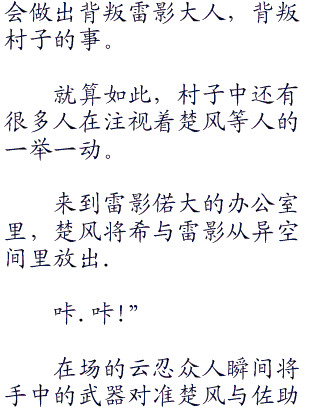 见拗不过奇拉比,两人也只好答应,期间为了方便雷影治疗,楚风将希与雷影吸入到异空间内。