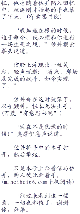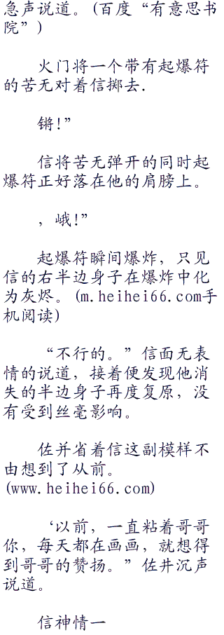 快逃啊,弟弟,你也省到他们对我身体做了什么,你是不可能赢的。”信对着佐并大喊道。