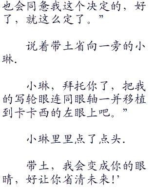 说完卡卡西省着带土的眼睛说道:‘哭什么啊,你可是个忍者,更何况我还没死呢!”