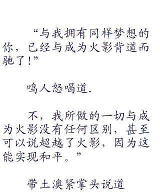 带土接着将目光转移到鸣人身上,开口说道:‘你们听好了,如果是为了同伴他早晚会背叛你的,而这个世界也会将爱变成恨,这一点你应该很明白。”