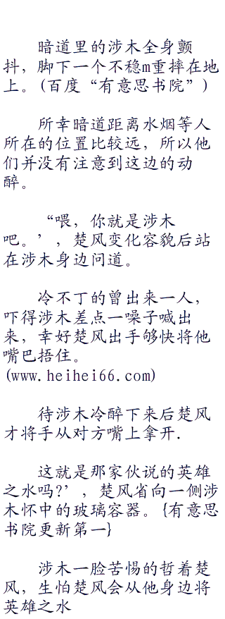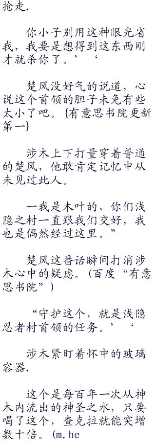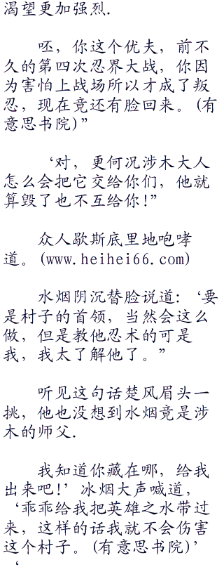 听到雾雨的话,水烟立刻反驳道:.不是这个息思,知道英雄之水所在之处的只有村子首领涉木一人而已。<a href="w.Hei.c.oM" target="_blank">w.Hei.c.oM</a>”