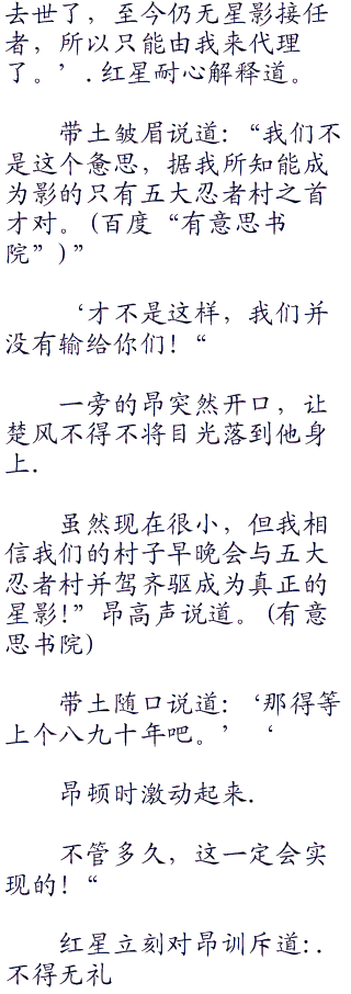 ‘据说数百年前,一颗星星坠落在村子里,最后便有了现在的忍者村。”小南也有所耳闻。