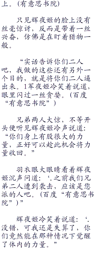 只见羽衣盯着辉夜姬看了片刻,然后对着身旁的弟弟说道:‘罢了,母亲的决定很难更改,我们只能那样了。”