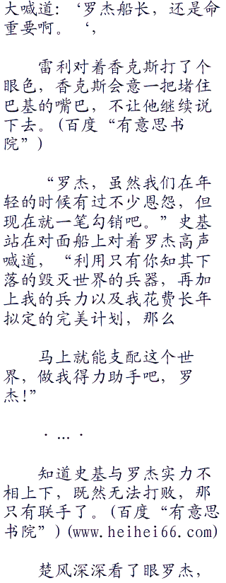 船医库罗克斯直接给敲了巴基一拳让他冷静下来,然后告诫他现在已经是果实能力者了,以后绝不能下海。有意思/~书院
