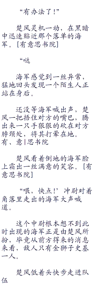 就在楚风一筹莫展的时候,角落口出突然走来一个落单的海军。