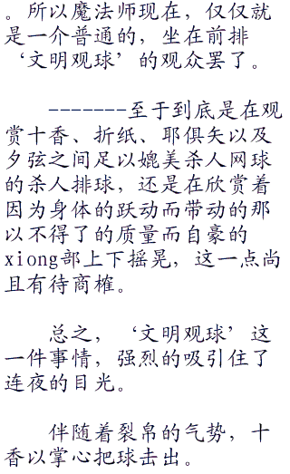爱莲身上发生了这种让人开心的坏事,连夜也只能暗暗的吐槽这个世界最强的魔术师在日常情况下的脱线,竟然被三个普通的女子高中生给制服了。
