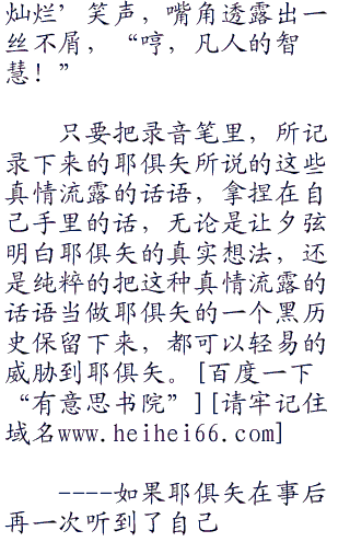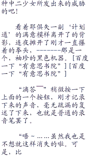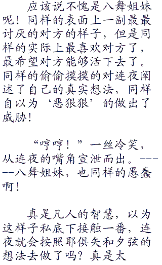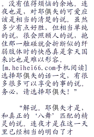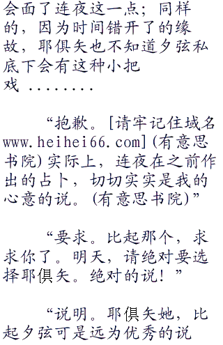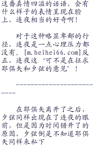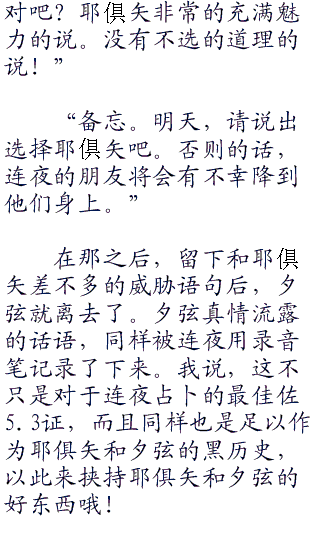 “那种事情,并不重要哈!”耶倶矢一瞬就移到到连夜的眼前,就像是要塞住连夜的嘴唇似的竖起食指。“这可不是在征求连夜的意见呀。你只要在明天,说夕弦妳更可爱的说啾啾,可爱可爱夕弦炭呼哈呼哈的就可以唷。不然的话,就把这个岛上你的朋友全部都吹走了啊!!”