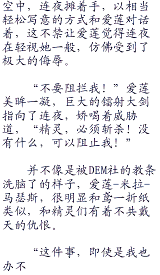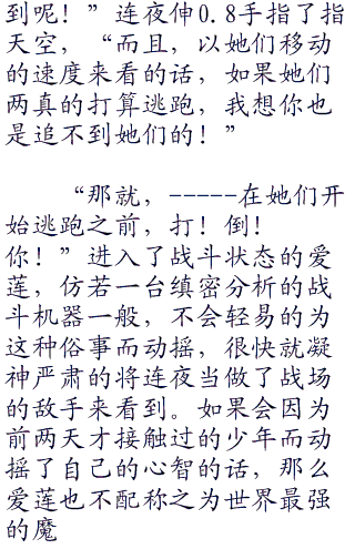 没有错,在风暴之中,还悍不畏死的冲向了暴风眼的中心部位的白色人影,毫无意外,就是爱莲-米拉-马瑟斯,----世界上最强的魔术师!拥有着可以打败精灵的强大战斗力!