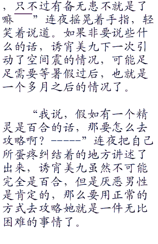 ------在美九是一个百合倾向的女性,极度厌恶男性的情况下,连夜简直就是第一步都没有办法跨出去,又谈何‘攻略’和‘让美九娇羞’一说呢?