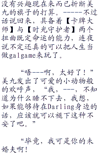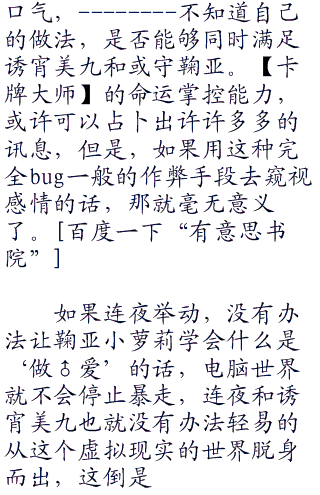 或守鞠亚无意识的喃喃呓语,作为一个大数据库化身的电脑精灵,她的智商和对信息的处理能力,绝对是远远超过了人类的,但是处理起这些让她无法理解的情愫的时候,脑袋回路里的那些分析能力,就完全的失效短路了。