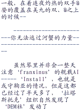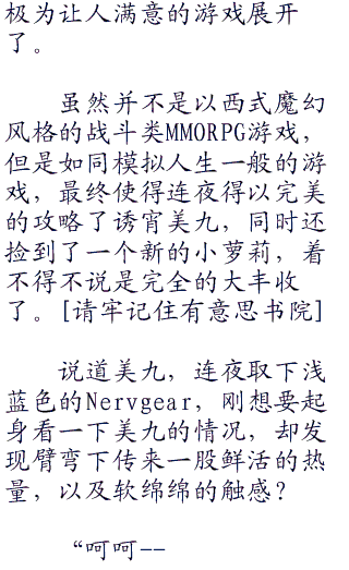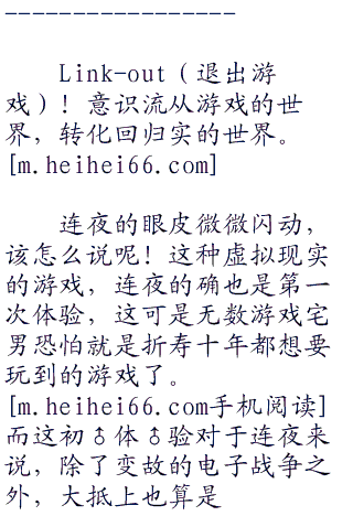 在这场突兀的电子战争之后,连夜和诱宵美九都登出(lock-out)了这个游戏世界,因为被病毒破坏了的缘故,这个世界如果要再一度开放,尚且需要或守鞠亚进行很长一段时间的修补,所以连夜和美九,也就暂别了这游戏。
