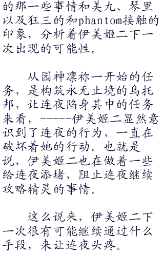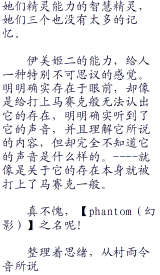 所以从维斯考特背叛的变故,一直到现在位置的数十年时间里,村雨令音一直在找寻着让精灵们可以安逸的生活下去的方法。作为初始的精灵,作为精灵们的