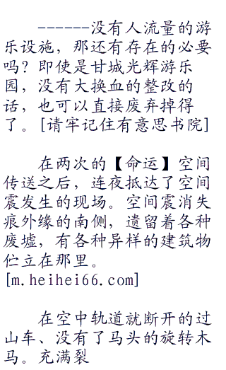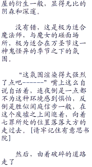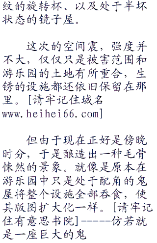 开启了【命运】技能之下,连夜可以占卜大范围空间之内,各种人的情况和命运之类的景象。由此很快就定位到了【Witch(魔女)】-----七罪所处的位置。那是出于天宫市另一侧的角落的游乐园,-----但是,与其说是游乐园,倒不如说就是一片巨大的鬼屋。因为这家游乐园,是在之前发生的空间震灾害下导致了没有人敢来这里游玩的一座游乐设施。
