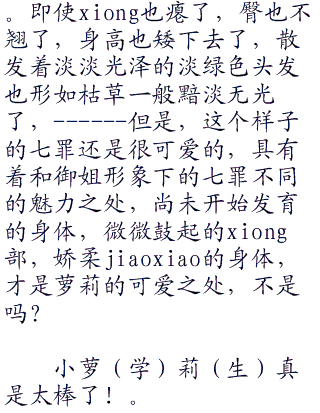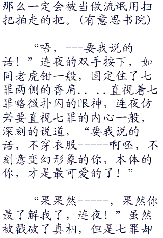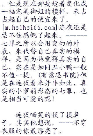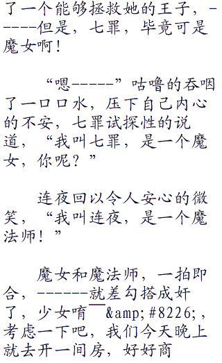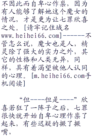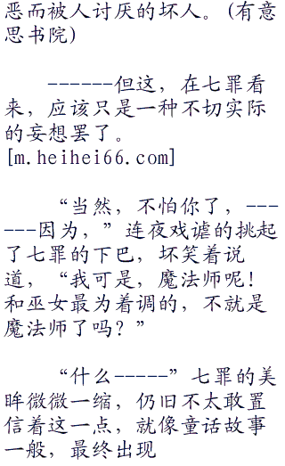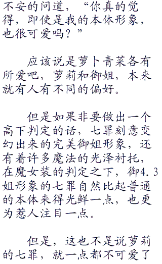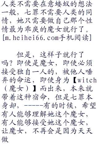 所以,不管从什么情况上来看,七罪虽然一副古灵精怪的魔女形象,但是事实上却又如同中世界被逼上了陌路的魔女一般,处于绝境之中,-----没有一个人会认同她,每一个遇见她的人,都只会想要杀死她,就像每一个人都唾弃着施展巫术的魔女一般。