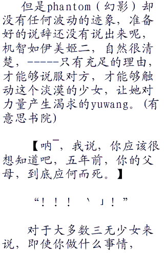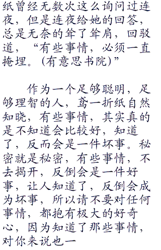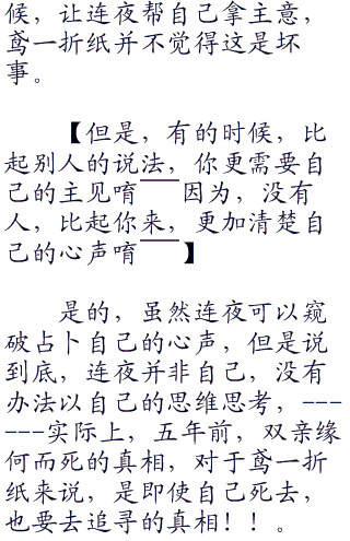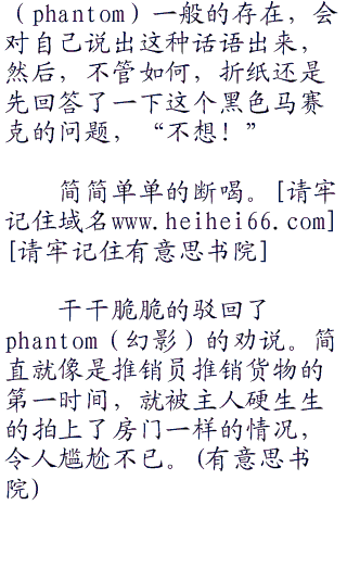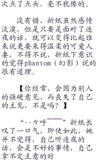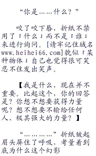 “-----呐~,我说、你想不想要力量呢?足够改变现在的格局的-----力量!”既不像男性也不同于女性的声音,像是从折纸的脑海里直接迸发出来一般,以平淡的语调,说服着鸢一折纸。