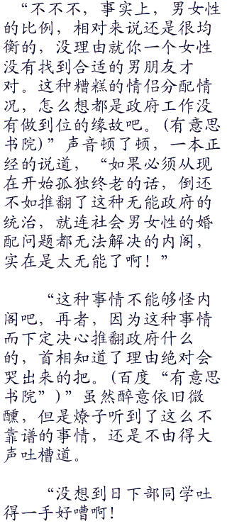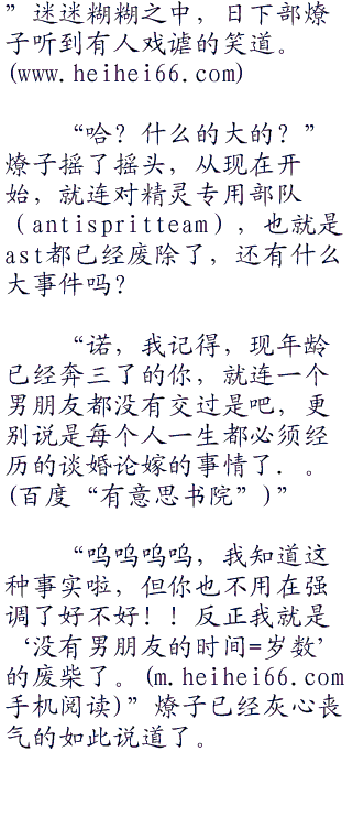 除了一点,在发现自己的年龄不可遏制的奔向了岁,而自己至今仍然保持着‘没有男朋友的时间=岁数’的尴尬纪录。虽然燎子是孤儿,并没有父母会催促她去相亲什么的,但是处于这个尴尬岁数的女人,大多都是很敏感的。