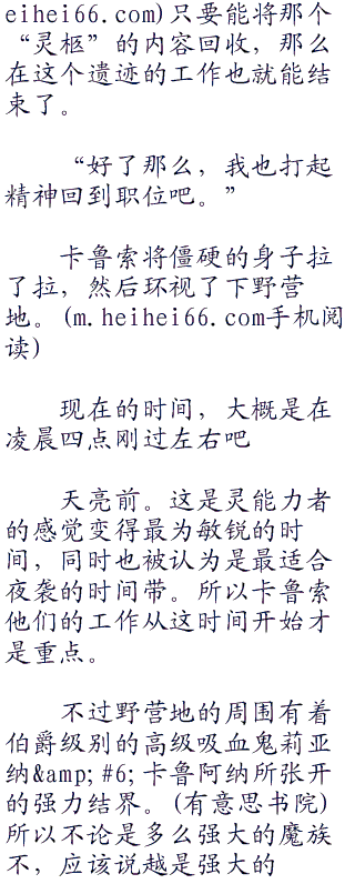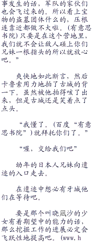 “原来如此啊,那还真是可靠啊。毕竟这个遗迹不论是超音波检测还是探查魔术都不起作用,所以说老实话我们本来是束手无策的。就拜托你了哦。”卡鲁索像是信服了一般点了点头。