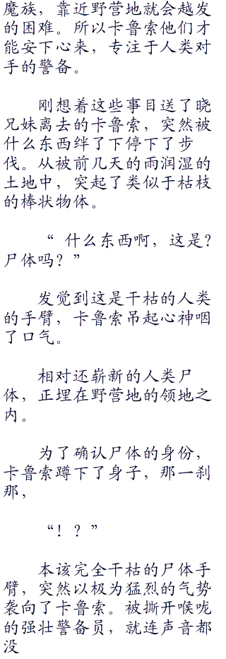 然而遗迹调查团的出资者们还是半强硬地叫了凪沙,而牙城也勉勉强强接受了。也就是说这次的遗迹调查就是如此的重要,也同时伴有危险。这点光是看野营地周边的严密警备就能微微想象到了。