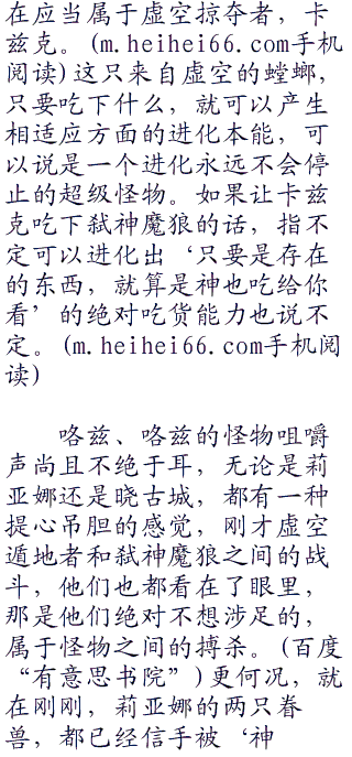 ‘吃人流’一直是许多大能增加实力的快速捷径,而对于那些来自‘虚空’的怪物来说,通过捕食其它的怪物,来使自己得到进化的增幅,更是理所当然的丛林法则。不过,即使蕾珂赛把整只弑神魔狼都吞下肚子,恐怕也就是饱一饱自己的口腹之欲,以及让连夜和‘黑死皇派’的仇结得更加死一点而已,实际上并没有办法让自身的任何能力产生进化增幅,即使是虫群之心,进化也是一直循序渐进的过程。