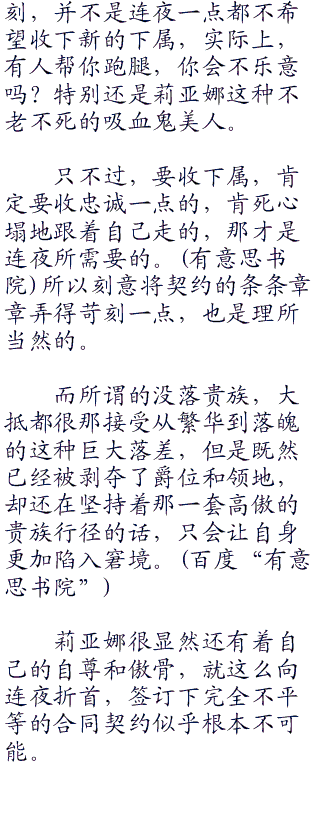 “”莉亚娜一下子陷入了泥潭之中,不上不下的,和连夜交战?她可没有这种本事。但是为今之计,她也只能够看着别人的眼色行事。