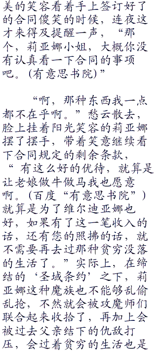 “这样吧,如果你愿意的话,就把这纸合同契约书签了,跟着我干事吧!”无奈之下,连夜微微一笑,从随身空间里拿出了一纸合同