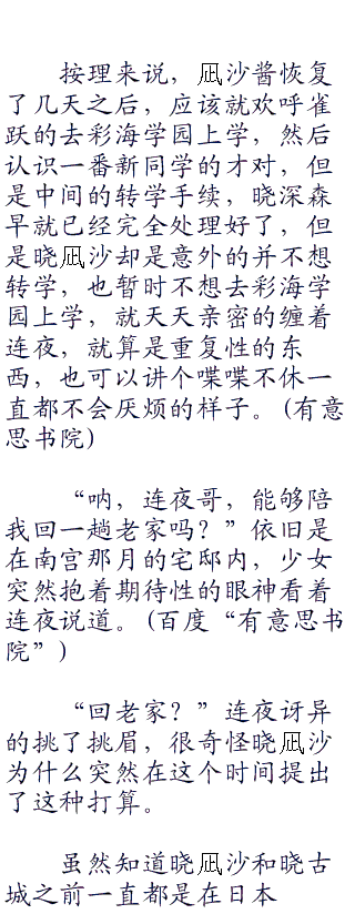 第二天,晓凪沙正式的出院了。因为她身体的虚弱原因,本来就是因为‘原初的第四真祖’造成的,在众星之子索拉卡将这种邪恶魂灵祛除并抹杀了之后,晓凪沙的身体自然很快就恢复了元气。