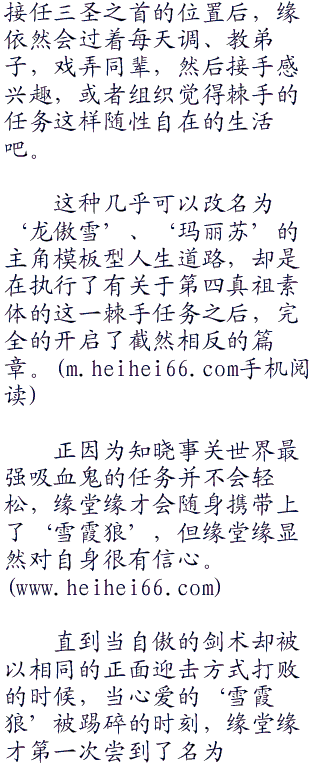 狮子王机关创立以来,最有天赋的攻魔师,简直是百年难遇的天下少女,缘堂缘是具有‘梅托色拉的后裔’血统的卓越人物,也只有具有这个据说是超古代人‘天部’血统的人物,才能够使用核心为天部制造的三大圣枪之一的‘雪霞狼’。
