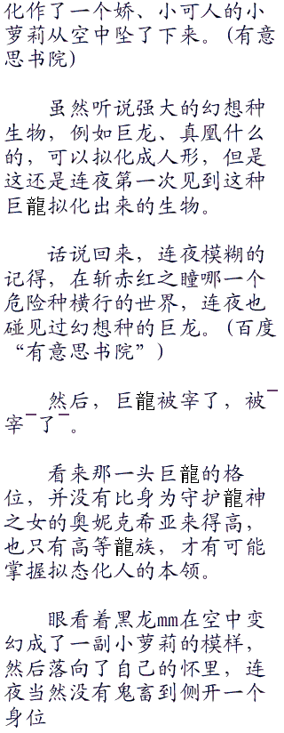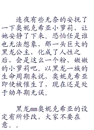 好不容易才从空中下来,连夜正打算思考如何处置这些魔女,并且将黑龙公主奥妮克希亚遣送回异世界的时候,却发现奥妮克希亚却是先一步的扑腾巨大的龙翼飞了下来。