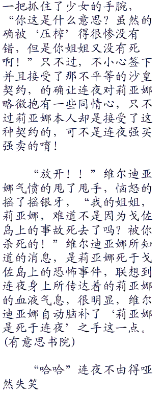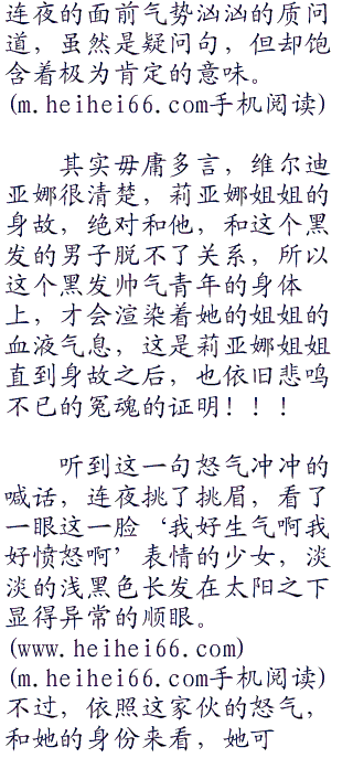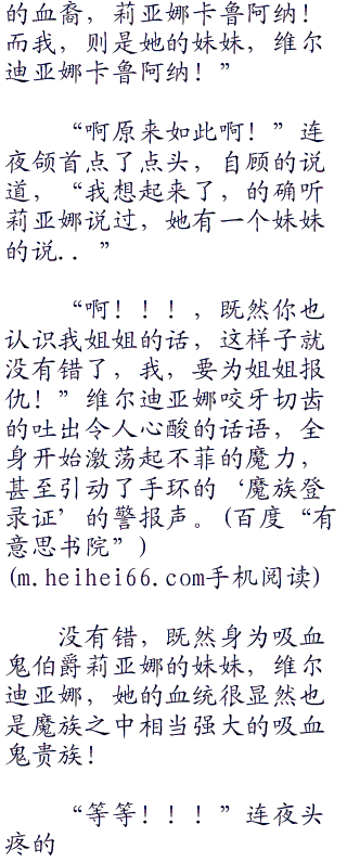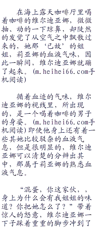 空气之中传达出来的气味,那,是属于她那已故的姐姐的血液气味!维尔迪亚娜猛然的察觉到了这一点,鼻子微微抽、动了一下,对于她姐姐的血液气息,她还是很敏感的,因此,维尔迪亚娜卡鲁阿纳可以确信,这个味道,绝对是她那‘已故’的姐姐,莉亚娜卡鲁阿纳的血液气息。