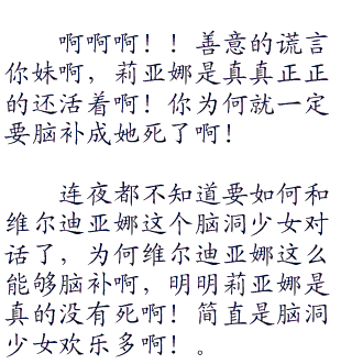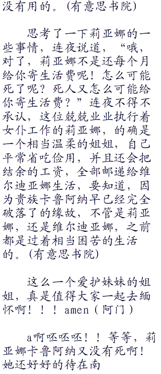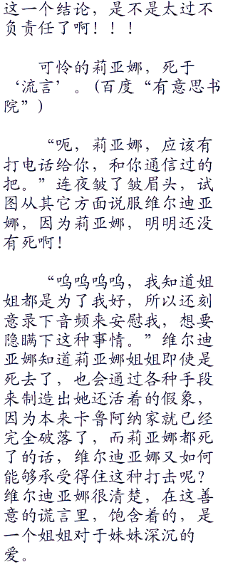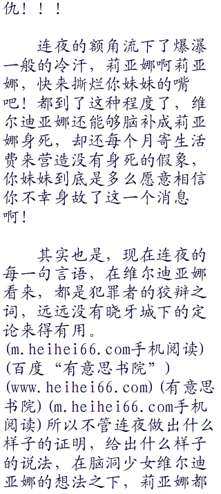 连夜面色古怪的摇了摇头,反驳维尔迪亚娜道,“你姐姐明明还没有死啊,你听谁说她死了的?”好吧,要是莉亚娜知道自己一直被自己的妹妹以为身死了,会不会气得怒掐维尔迪亚娜的脸颊呢?毕竟对一个尚且健健康康的活着的人来说,一直说死死死的,可是相当惹人嫌恶的事情。