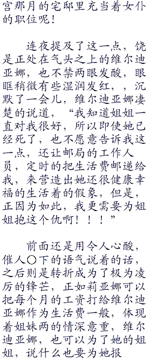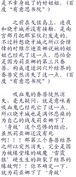 “晓牙城,那位知名的考古学家是这么说的!”维尔迪亚娜信誓旦旦的说道,“他和我姐姐同属于戈佐岛遗迹调查团的成员,所以他不可能会骗我的!”维尔迪亚娜又不是傻子,相较而言,一个可能是杀死自己姐姐的人的诡辩,和一个自己姐姐的同事的证词,哪一句言语更有可信度,这不是很简单的选择题嘛!很明显这个时候,维尔迪亚娜更愿意相信晓牙城的说法,虽然是很不幸的消息,但是她的姐姐,莉亚娜已经死于戈佐岛上那一次的魔族恐怖事件了。