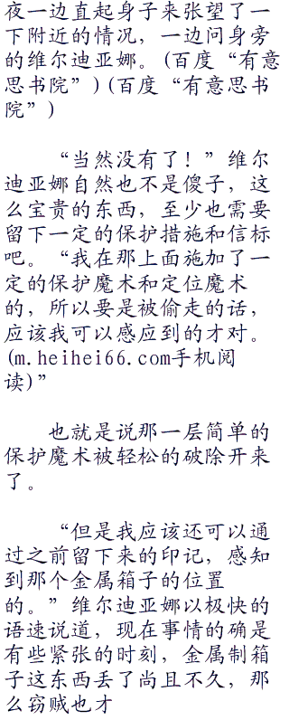 “就是这个样子的一个金属箱子”维尔迪亚娜呆呆的用双手比划道,“大概有2尺长,1尺宽,里面还装着很重要的东西。”