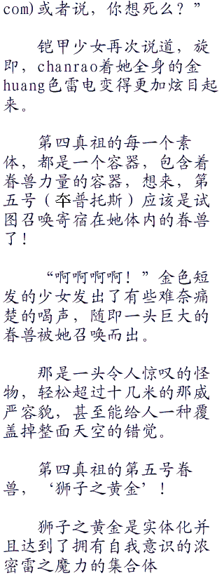 即使南宫那月,也不是很清楚这种极度机密的消息。作为人类之中数一数二的‘空隙的魔女’,南宫那月大概模模糊糊的知道,战王领域掌握着几号第四真祖“零零零”的素体,混沌界域和灭绝王朝亦然掌握着各自几号第四真祖的素体,其他的一些素体,则是被掌握在一个名为扎哈利亚斯的军火商人的手里。