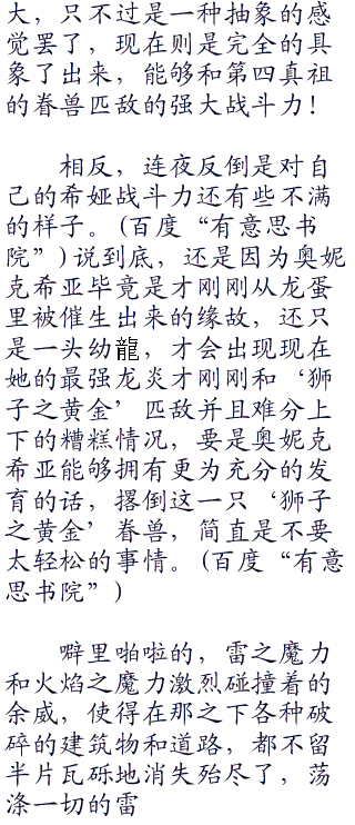 ‘狮子之黄金’是完全的雷电之魔力化身,因此它只是在第五号(夲普托斯)的驱使之下,单纯的以身体冲撞向了空中的奥妮克希亚,因为以它那完全由雷电构筑而成的身体来冲击,这就是足够强大并且无比强大的一击了!