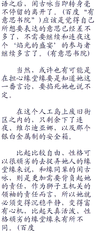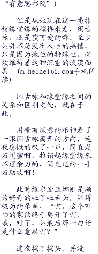 想来是闲古咏知道自己的这一个好友,对于连夜有着一丝半厘的好感,同时又担心太过蛮横、性格顽劣的她不是很讨人喜,担心连夜会因此嫌恶了缘堂缘的缘故,才会刻意以私谈的方式,向连夜说了这么一番推销员的话语。
